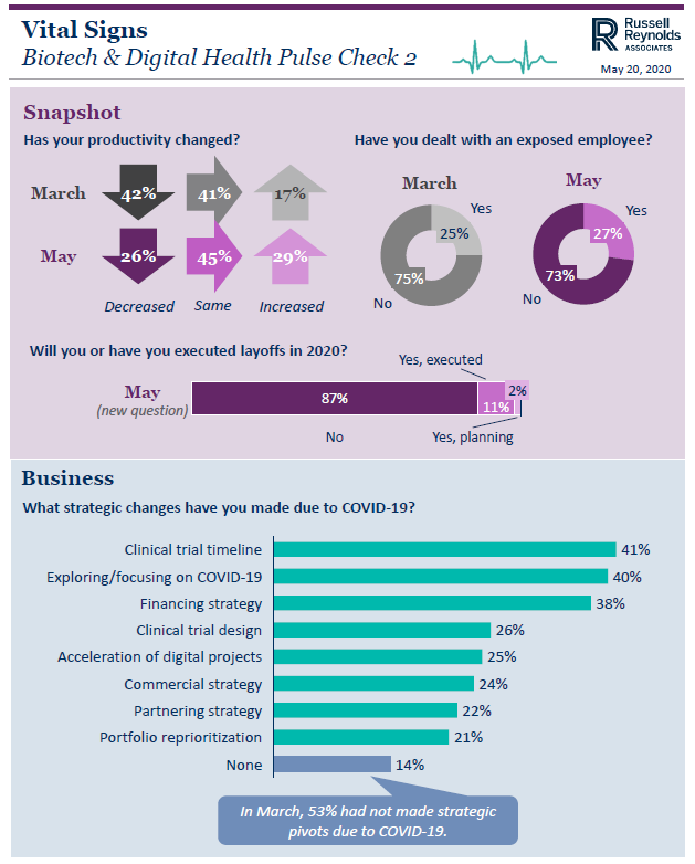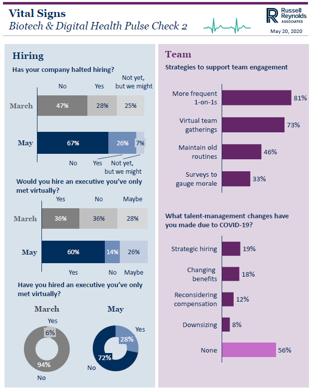 I’m pleased to release the results of our second Vital Signs Pulse Check. Please see below (note there are 4 pages). We first surveyed the market in late March, about a week after shelter orders. It’s fascinating to see which responses have shifted – and which haven’t. Most notably, there’s statistically no real change to the question, “Have you dealt with an exposed employee?” (25% Yes in March and about the same today.) But to the question, “Would you hire an executive you’ve only met virtually?”, 36% said Yes in March, and 60% said Yes today. That’s a pretty quick and dramatic swing! Nearly 90% of you are NOT planning layoffs (yay!). And how are you feeling? In March, you were really anxious and tired. Today, you’re mostly just tired.
