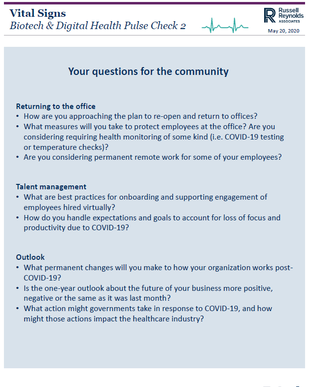 You’ll see on p. 4 questions you’ve asked the community. I’d love to connect with you if you have learnings to share with others on any of these topics (re-entry, team engagement and future outlook).
